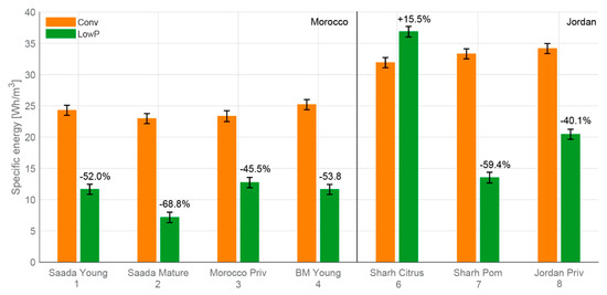 Specific hydraulic energy (total hydraulic energy per total volume of water delivered) at all experimental sites with sensor measurements for conventional (Conv) and low-pressure (LowP) emitters. In all cases, low-pressure emitters used less energy except at the Sharhabeel Citrus site, which had difficulty keeping the operating pressure at the low pressure setting. The percentages represent the change in specific hydraulic energy for low-pressure emitter plots compared to conventional plots.