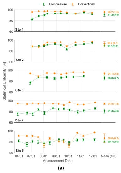 The results of uniformity measurements for low-pressure and conventional emitters, collected following the procedure described in Section 2.5.2, are reported as time series, along with the seasonal averages and standard deviations (Figure 8). In Morocco, the seasonal averages of statistical uniformity were 81–91% for low-pressure emitters and 87–96% for conventional emitters (Figure 8a). Uniformities for both emitter types remained steady over time, with standard deviations below 4% at all plots, except for the conventional emitter plot at Beni Mellal with mature citrus trees (site 5). At this plot, conventional uniformity varied between 73% and 97% throughout the season, with the lowest values occurring between August and October. This reduction in uniformity was attributed to the clogging of emitter outlets by ants and insect larvae. The low-pressure emitters were less affected.