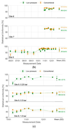 Statistical uniformity (SU) for all experimental plots in (a) Morocco sites (1–5); (b) Jordan freshwater sites (6–8); (c) Jordan wastewater site (9). Time series of uniformity over the season is shown, with the marker representing the measured SU for the sample size of 32 emitters per plot, and the error bars representing the standard error of the measurement. The seasonal means and standard deviations (in parentheses) are shown for each site as well. Low-pressure emitters have uniformities comparable to those of conventional emitters B in Jordan and slightly lower than those of conventional emitters A in Morocco.