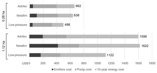 Unit costs of the pump (), emitters () in US$, the total number of emitters (), and the electricity () in US$ per kWh, are used to calculate the capital cost of the pump and emitter combination (), the operating cost over a number of years ) (Equations (A12) and (A13)). In this comparison study, maintenance costs or costs of the piping network are not considered as they are assumed to remain constant when switching between conventional and low-pressure emitters.