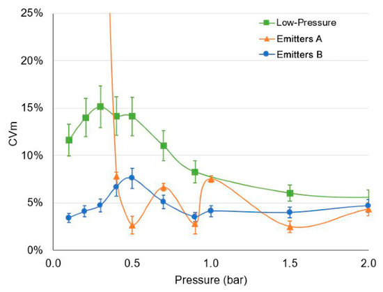 The manufacturing coefficients of variation () over a range of pressures for the low-pressure emitters was also measured following ISO Standard 9261:2004 [21]. The results of measurements (Figure 10) and their relation to water emission uniformity are discussed in Section 4.2.