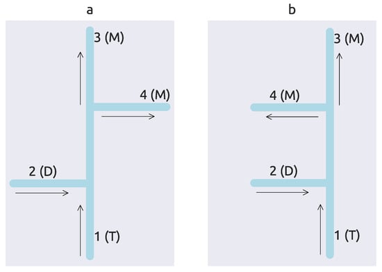 Two different experimental configurations with variable distance between two Tee junctions where inlet pipes are labeled as 1 and 2 and outlet pipes as 3 and 4. D represents distilled water, T represents tap water and M represents mixture: (a) Distilled water inlet and mixture outlet branch on opposite sides (configuration S). (b) Distilled water inlet and mixture outlet branch on the same side (configuration U).