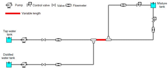 Since both distilled and tap water have a different initial electrical conductivity, the amount of mixing is determined by measuring the electrical conductivity of the mixture (S/cm) using an analog conductivity measuring cell (TetraCon 325 manufactured by WTW/Xylem Inc., Weilheim, Germany) and conductivity monitor (WTW LF 296 manufactured by WTW/Xylem Inc., Weilheim, Germany). The flow at both inlet and outlet pipes is measured with a turbine flowmeter (OMEGA FTB691A and FTB695A manufactured by OMEGA Engineering, Inc., Norwalk, CT, USA).
