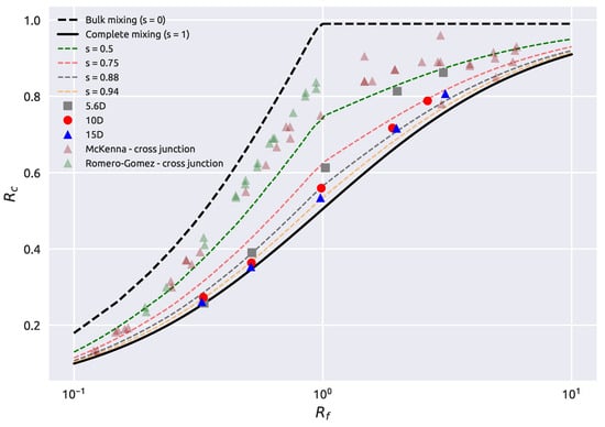Experimental results for the S configuration—relationship between branch outlet to main inlet pipe conductivity ratio and inlet flow ratio compared with previous studies [,] of cross junction mixing results. Dashed lines represent the value of mixing parameter s used in EPANET-BAM [].