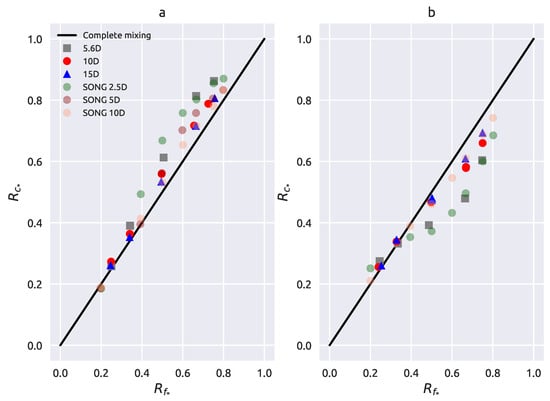 S and U configuration experimental results—normalized branch inlet conductivity ratio to normalized main pipe inlet flow compared with the previous study [] and shown in relation to the complete mixing line: (a) Configuration S, (b) Configuration U.