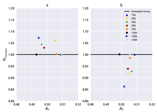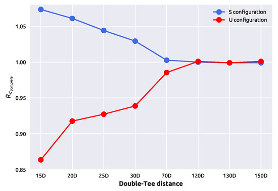 Influence of the double-Tee junction distance on complete mixing is analyzed for identical flow rates in all inlet and outlet branches and distances of 20D, 25D, 30D, 70D, 120D, 130D and 150D. In order to better visualize the behavior of mixing near the complete mixing line, the outlet conductivity ratio is defined as: