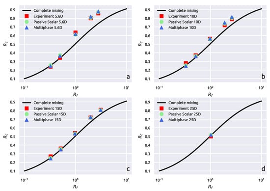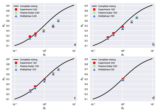 S pipe configuration—comparison of experimental results with passive scalar and multiphase model results for different Tee-junction distances: (a) 5.6D, (b) 10D, (c) 15D, (d) 25D.