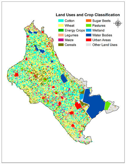Lake Karla watershed is located at the southeastern part of the Thessaly plain, Greece, and has an area of 1171 km2 (Figure 1). Agriculture is the main economic activity and as a result is the major source of income of the local population. The study area is included in the main agricultural region of Greece (i.e., Thessaly) and it is extensively cultivated with crops characterized by increased water and fertilization demands such as maize, cotton, and alfalfa [34]. According to Directive 91/676/EEC, the Thessaly plain area and especially Lake Karla watershed has been identified as Nitrate Vulnerable Zones (NVZs) from agricultural practices. Figure 2 shows the major land use categories and the spatial distribution of crop pattern for the year 2001, whereas Table 1 presents the Land Use and Crop Classification percentage areas and show that the arable cropping systems (cotton, wheat, maize, cereals etc.) dominate in the study area and cover 335.51 km2 or 67.10% of the total aquifer area.