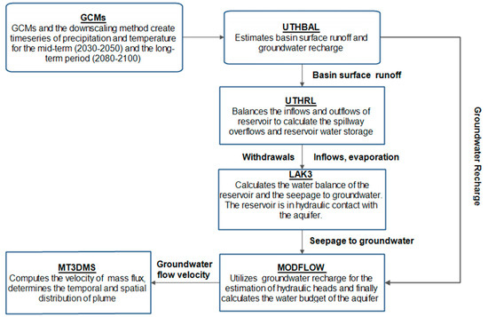 The proposed Integrated Water Modeling Framework is based on simulation and coupling of six mathematical models presented in Figure 3. Global Circulation Models (GCMs) [38] are used to produce future climate scenarios. The surface water processes and the groundwater recharge, among other hydrological variables, are simulated by the conceptual UTHBAL watershed model [43]. Monthly areal time series of precipitation (12 precipitation stations), mean temperature (26 meteorological stations) and potential evapotranspiration (calculated by Thornthwaite method) were used as inputs. The water balance model uses a soil moisture mechanism to allocate the watershed runoff into 3 components namely, the surface runoff, the medium runoff, and the baseflow runoff. In this study, the UTHBAL model was applied in a semi-distributed mode considering the hydrological components of lowland area. The surface runoff was used as an input data to both UTHRL and LAK3 models, while groundwater recharge was passed to MODFLOW model. UTHRL [43] is a mass balance model and it was set up according to the reservoir’s volume-water stage curve as proposed by the constructors. It is a simple monthly conceptual model using the general equation of reservoir’s water balance to describe its operation in a monthly time step. It has as inputs the natural runoff of the basin, the direct rainfall to the reservoir, and the flooded waters of Pinios River. The outputs are the withdrawals for irrigation, the evaporation, the spillway overflows, and reservoir seepage to groundwater. The LAK3 module [44], is connected with the UTHRL, receiving the reservoir water stage and the reservoir stored volume, and calculates the reservoir seepage to groundwater. The lake-aquifer interaction is simulated in transient flow conditions, by updating at the end of each time step a water budget for the lake that is independent of the groundwater budget represented by the solution for heads in the aquifer. Implicit in the calculations of a lake water budget is the recalculation of current values of lake volume and stage. The reservoir seepage is, then, used as input for MODFLOW model. Groundwater flow and the nitrates transport processes are simulated using MODFLOW [45] and MT3DMS models [46], respectively. The UΤHBAL, UTHRL and LAK3 models have been presented, in detail, in previous papers [36,40].