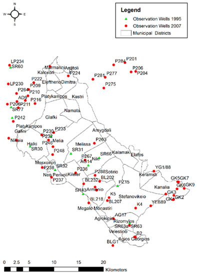 - Papaioannou, A.; Plageras, P.; Dovriki, E.; Minas, A.; Krikelis, V.; Nastos, P.T.; Kakavas, K.; Paliatsos, A.G. Groundwater quality and location of productive activities in the region of Thessaly (Greece). Desalination 2007, 213, 209–217. [Google Scholar] [CrossRef]