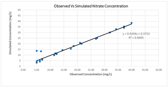 The model calibration procedure is followed in order to assert that the simulated nitrate concentration values are close to the observed ones. The model was calibrated considering the nitrate leaching parameter as the guidance criterion, using the trial and error approach for the observed nitrate concentration data values on 1 September 2007. The visual inspection of Figure 5 (R2 = 0.96) and the performance measure explained by the Nash–Sutcliffe model efficiency coefficient (Ef = 0.95) demonstrated the successful calibration process. The validation process of MT3DMS took place on September 2008 and 22 wells were used. Moreover, the statistical parameter R2 was used for the validation period and it was equal to 0.83. Table 2 shows the starting and final parameter values before-and-after the calibration process of the most significant crops.