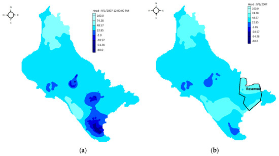 Hydraulic head results of the operational scenarios modeling: (a) No-reservoir scenario hydraulic heads; (b) reservoir scenario hydraulic heads.