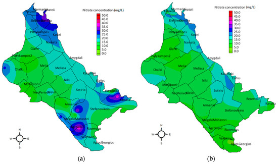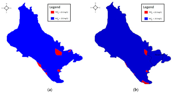The maximum allowable nitrate concentration limit according to Directive 98/83/EC is the value of 50 mg/L, while the upper limit of 25 mg/L is also defined as the ‘‘guidance value’’, above which the water is characterized as not appropriate for domestic use, since above the defined nitrate upper threshold, severe health issues are caused. The nitrate transport modeling of the no-reservoir scenario showed gradually increasing concentrations of the nitrate compounds in the aquifer, in analogy to the fertilizer application rates on the studied area. The presence of the reservoir, conversely, leads to the increased reservoir’s recharge and the decrease of nitrate concentrations in the groundwater system. Furthermore, the reservoir operation leads to local decrease of nitrate concentrations in the surrounding areas, even below the upper indicative threshold of 25 mg/L, as shown in Figure 8a. Regions with nitrate concentrations above the indicative threshold of 25 mg/L for both the no-reservoir and the reservoir scenario, respectively, are depicted in Figure 8b. As a result, for the inversion of this environmental degradation and the prevention of water pollution, radical measures should be taken for the study area, following the application of good agricultural practices, and the adoption of efficient irrigation methods for the no-reservoir scenario.