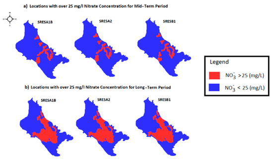 The maximum nitrate concentration value range increased from 31.87 mg/L in the mid-term period, to about 50 mg/L in the long-term period due to climate change without antropogenic activities (no reservoir operation). The highest values of nitrate concentrations was recorded to be 50.48 mg/L in the long-term period of the SRESA2 scenario. Furthermore, the highest values of nitrate concentration were observed at the south-eastern region and portrayed in Figure 9. Additionally, the lowest values of nitrate concentrations were recorded in the mid-term period of the SRESA1B scenario in the north-eastern and south-western part of the study area and are also presented in Figure 9. On the contrary, the nitrate concentration values ranged from 0.20 to 32.64 mg/L, in the historical period. The maximum nitrate concentration value of 32.64 mg/L was recorded in the southeastern area while the minimum value was encountered in the northern part of the study area.