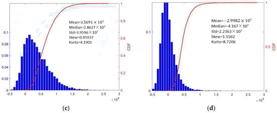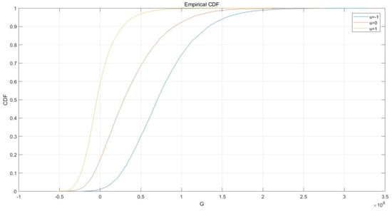 The simulated government subsidy is illustrated in Figure 4. The mean value of the government subsidy was 3.48 × 107 CNY without short-term uncertainty. The subsidy increased to 7.51 × 107 CNY when the mean value of the short-term uncertainty is positive (). Additionally, as the mean value of the short-term uncertainty changed from 0 to −1, the subsidy decreased from 3.49 × 107 CNY to −2.99 × 107 CNY. An increase in subsidy could lead to high-performance costs for the government and prevents the PPP contract from being successfully completed []. Over-valuation caused by not taking into account short-term uncertainty may explain unprofitable projects []. From the above statistic, we can see that the government subsidy increased about 115% when the mean value of short-term uncertainty increased to 1, compared with the revenue without the short-term uncertainty. Additionally, the government subsidy decreased about 185% when the mean value of the short-term uncertainty decreased to −1, compared with the revenue without the short-term uncertainty.