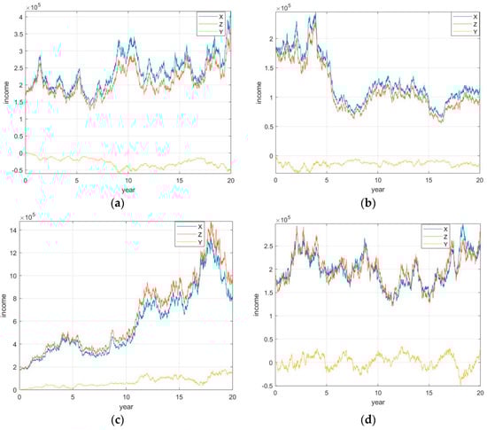 We can see that the noise revenue fluctuates around a mean value which is near zero and that the actual revenue has a very significant correlation with the estimated revenue. When , the actual revenue Z is parallel to the main direction of the estimated revenue X, which means that when the external conditions produce a positive effect on the project, the actual revenue exceeds the estimated revenue. When , the movement of the actual revenue Z and the estimated revenue are in opposite directions, which means that when the external conditions produce a negative effect on the project, the actual revenue is smaller than the estimated revenue.