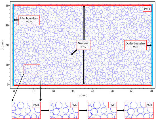 The boundary condition of the flow field is schematically illustrated in Figure 1. In each model, the left and right boundaries are set to be the first-type boundary. The steady-flow is induced from left to right by the given pressure drop. The no-slip boundary condition is applied at the solid–liquid interfaces. There is no flux across the top and bottom boundaries.