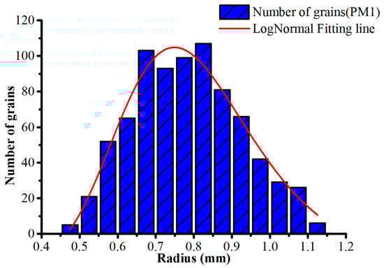 In this study, 795 solid grains were randomly distributed in a two-dimensional domain of 70 × 40 mm2, as shown in Figure 1. The corresponding porosity of the generated solid grains in this two-dimensional domain was 0.45. It should be mentioned that a checking algorithm during the random distribution process of the solid grains was used to avoid the overlapping solid grains. In addition, to obtain the different degrees of the cementation in the same porous media model, we assumed that a minimum distance between any two solid grains was set to be one-fifth of the mean radius. As can be observed in Figure 1, the solid grains were totally free and non-overlapping. The solid grains’ mean radius and the coefficient of variation (COV) were set to 0.8 mm and 0.2 mm, respectively. The original porous media in Figure 1 was named as PM1. The probability distribution of the radii of the solid grains is shown in Figure 2.