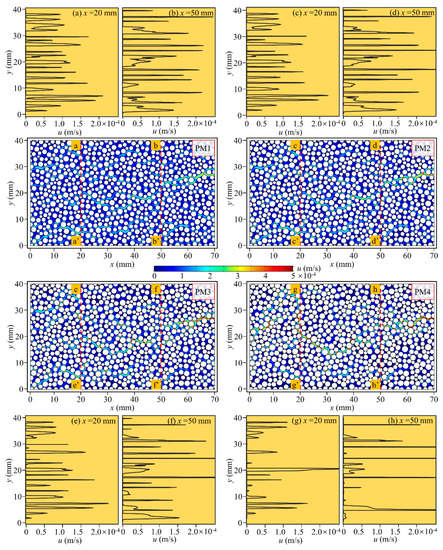 As can be seen in Table 1, for PM1–3, the decreases as the radius of solid grains increase, while the keeps constant due to the fact that the solid grains in PM1–3 are not cemented. When the average radius of PM4 increases by 13.12%, the corresponding porosity decreases and the cementation degree (the ratio of cemented solid grains to all solid grains) becomes 89.13%—associated with the decrease of . Although the decreases by 33.77% in PM4, the slightly increases and is larger than that in PM3. This could lead to the spatial velocity variability of the flow field. The spatial velocity variability of the flow fields was quantitively analyzed by introducing a coefficient of velocity variation () in the Section 3.2.