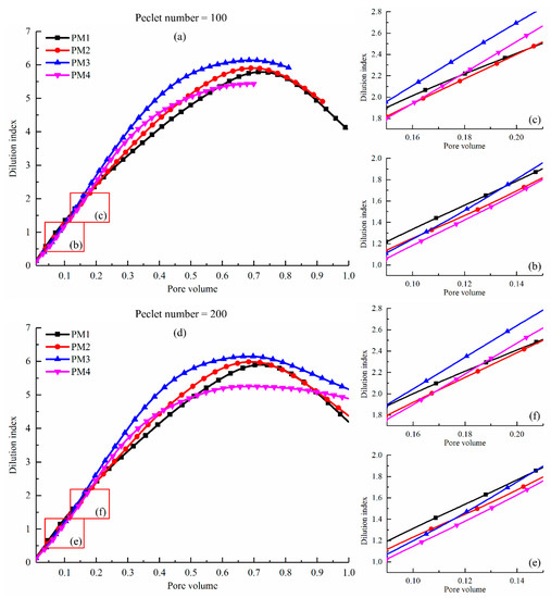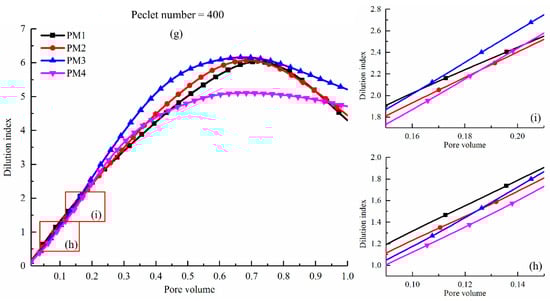 The dilution index in PM1–4 was calculated at the Pe = 100, 200 and 400, respectively, as shown in Figure 4. In general, the cemented porous media has a significant influence on the dilution index, while the Pe has little influence on the dilution index for a given porous media. At the first stage (Pv < 0.1) as shown in Figure 4b,c,f–h, the dilution index in PM1 and PM2 are a bit greater than that in PM3 and PM4. As the Pv increases, the dilution index monotonically increases. The value of the dilution index in the highly heterogeneous porous media (e.g., PM4) begins to exceed that in the mildly heterogeneous porous media (e.g., PM2 and PM3). It is worth noting that the dilution index in PM3 is greater than in PM4 during the entire process. Although the porosity of PM4 is the smallest among all porous media, the corresponding peak value of the dilution index in PM3 is the largest (see Table 3). Considering the analysis of the flow field, this indicates that the enhanced preferential flow in PM4 has a negative influence on the dilution of the solute plume. At the same Pv condition, the ratio of the fluid volume that flowed into the porous media to the pore space volume is the same. The solute transports mainly along with the fluid flow. It could be found that, in Figure 5, the concentration distribution for the Pe = 400 is almost same with it for the Pe = 100. Since the dilution index is a measure of porous media volume occupied by a solute plume. Therefore, the change in Pe has little influence on the dilution index for the same porous media.