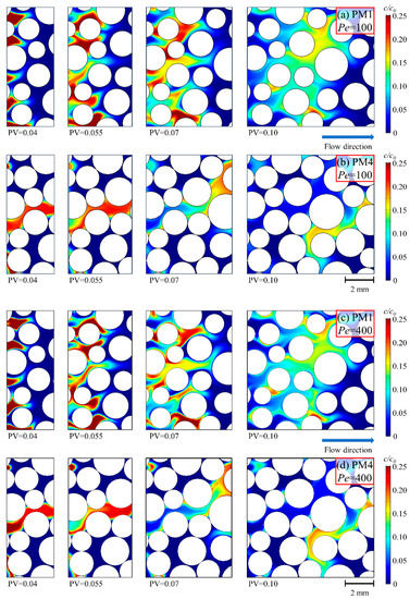 Figure 3 shows the flow fields in PM1–4 with the Pe = 100. The color contrast in PM1 is small and represents a relatively uniform velocity distribution. A network consisting of several preferential flow paths could be found in PM1. The velocity reaches the maximum value in those flow paths. As the radii of solid grains increase and the pore space gradually narrows, the morphology of the pore space become complicated, causing a pronounced flow velocity variability. In PM3 and PM4, the area of the dark blue color regions increases, which represents that the local flow velocity is much smaller than the average flow velocity. The flow velocity in the preferential flow path in PM3 is higher than that in PM1 and PM2. Since the cemented solid grains formed several groups of the solid grains in PM4, the preferential flow paths become more irregular than that in PM1–3. The flow velocity distribution in PM4 is the most non-uniform. In PM4, the preference flow paths, which originally existed in PM1, turn into a continuous dominant path connecting the inlet and outlet boundaries. It can be seen in PM4 that there are some stagnant regions where the fluid flow is almost immobile, especially near the top and bottom boundaries. Thus, the preference flow in PM4 is enhanced.