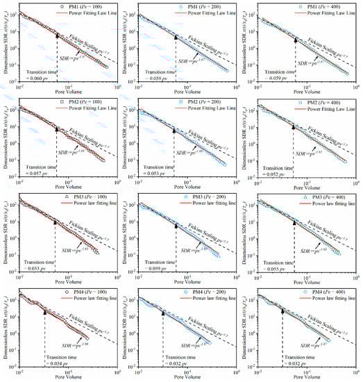 In addition, as shown in Figure 6, the exponent of each best-fitting power-law is less than −1.5, reflecting that the temporal mixing is non-Fickian. Therefore, using the one-dimensional analytical SDR will underpredict the true SDR [36], especially at the case of the high Pe or the highly heterogeneous porous media (e.g., PM4). In the non-Fickian regime, the slope of the global SDR reflects the dimensionality of the mixing process [37]. The result shows that the mixing in porous media after transition time is intermediate between the 1D and 2D behaviors.