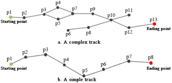 The complexity of a trajectory was first quantitatively measured by a complexity index η (0 < η ≤ 1), which is the ratio between the number of the points along the branch(es) and all points on the trajectory. Figure 1a illustrates a complex trajectory. At a specific time-stamp, the eddy represented by point p3 splits into two eddies p4 and p5, which then merge into eddy p7. At another time-stamp, eddies p8 and p9 merge into eddy p10, which then splits into eddies p11 and p12. The total number of points along this trajectory is 13 and nine of them are on the branches. Therefore, the η is 0.69. A simple eddy trajectory (Figure 1b) is a linear structure without any branches thus has a complexity index 0 (η = 0).
