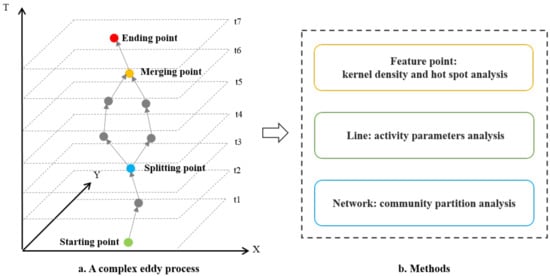 A diagram showing the structure of an eddy trajectory, which is represented as different objects (points, lines, and networks) (a), which were then examined using different methods (b).