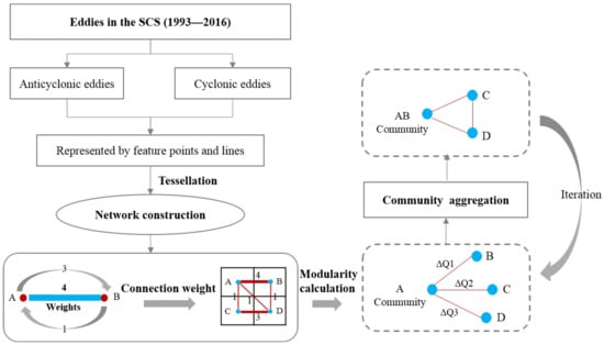 The fast unfolding method includes two major steps in a sequence (Figure 3). The first step is to construct the movement network. We generated tessellated square grids of 1° × 1° to cover the whole study area and the center of each grid was represented as a node. We then counted the total number of eddies within each grid (node), respectively. The connections between any two adjacent grid nodes in the network were weighted using the total number of eddies that crossed their boundary. A network thus was constructed with the nodes representing the grids and edges the total number of eddies that crossed the boundary of two adjacent grids.