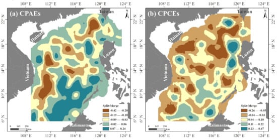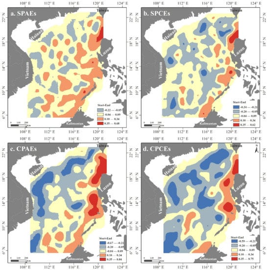 The kernel density difference of the starting and ending points of the SPAEs (Figure 4a) and SPCEs (Figure 4b) showed that the eastern SCS witnesses more births than deaths of SPAEs and SPCEs, respectively. The death places of SPAEs and SPCEs were scattered across the whole SCS.