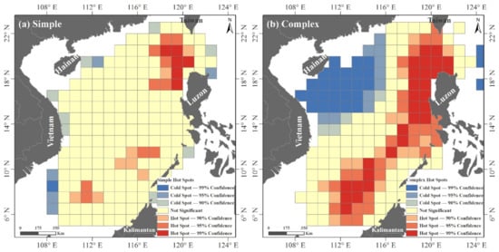 Figure 5 shows the hot and cold spots of where the simple and complex eddy processes originated, respectively. The hot spots were mainly located in the eastern SCS whereas the cold spots were mainly located in the western SCS. Such a pattern indicates that the eastern SCS was where most eddies start from. However, the hot spots of the complex eddy processes were more extensive and continuous in the eastern SCS, covering the area from the southwest of Taiwan, west of Luzon Strait and Luzon, Huangyan Island, Nansha Islands, northwest of the Kalimantan. By contrast, the hot spots of simple eddy processes were more isolated in the eastern SCS and could only be found in the southwest and northwest of Luzon and Palawan, southwest of Nansha Islands (7° N–9° N, 110° E–113° E). The same pattern was also found for the cold spots. Extensive cold spots were found for the complex eddy processes in the northwestern SCS. The cold spots of simple eddy processes were isolated and found in only a couple of grids in the east of Hainan Island and the southwestern SCS.