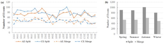The statistics of splitting and merging events of CPAE and CPCE by year (a) and season (b).