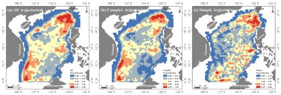Figure 8 shows the trajectory density of all (a), complex (b), and simple eddy processes (c) in the SCS, respectively. There was no significant difference between the trajectory distribution of all and complex processes, with higher density in the southwest of Taiwan and northwest of Luzon, west of Mindoro, and east and south of Vietnam. The trajectories of simple processes also concentrated in the southwest of Taiwan and northwest of Luzon. However, more trajectories of simple processes were found across an extensive region in the southwestern SCS.