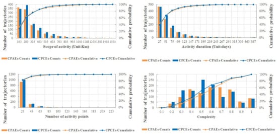 Activity space in geography is mainly used to examine human activities within a space [51,52]. We employed the same idea and computed four indexes, namely the complexity, activity duration, activity scope, and the number of activity points, to study how an eddy migrates within an activity space. The complexity, as discussed in Section 2.2, showed how complex an eddy trajectory is. The activity duration referred to the lifespan of an eddy, indicating how long an eddy process lasted. The activity scope was defined as the maximum distance between any two points along a specific track, indicating the maximum span within which an eddy was moving around. The number of activity points was the number of different positions that an eddy may occupy over its life span. More activity points suggested a more active eddy process.