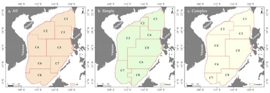 The SCS beyond the 200-m bathymetry contour line could be divided into eight communities based on the networks built from all, simple, and complex eddy processes, respectively (Figure 10). The communities were roughly similar. Particularly, the community delineation results based on the complex- and all-eddy networks were very similar (Figure 10a,c). Roughly, the northern, central, and southern SCS could be divided into three, two, and three communities, respectively. However, difference does exist. For example, only one community was partitioned from the all-eddy networks in the southern part of the southern SCS (C8 in Figure 10a), whereas this region was divided into two simple- and complex-eddy communities, separately. A community was identified in the east of Hainan Island and Vietnam based on the simple-eddy networks (C3 in Figure 10c). This region was divided into two communities based on the complex- and all-eddy networks.