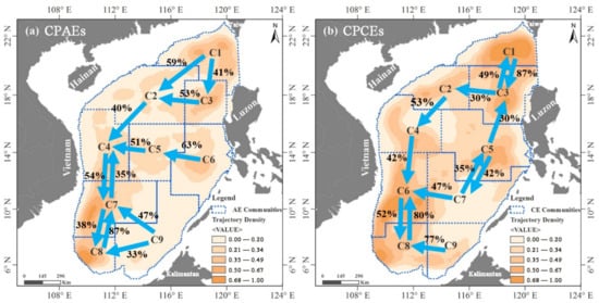 The CPCEs in the northern SCS (Figure 11b) showed a strong interaction between the communities in the west of the Luzon Strait (C1) and the northwest of Luzon (C3). In the central SCS (C4, C5, C6, C7), interaction was more notable between C5 and C7 in the southwest of Luzon. In the southern SCS, interaction was more prominent in southeastern Vietnam between communities C6 and C8, C9 and C8.