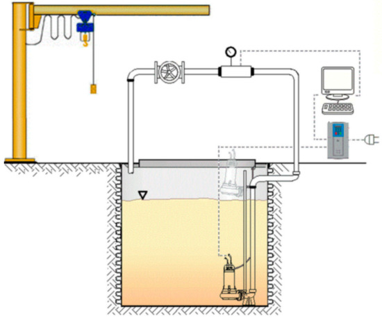 The design of the pumping system has been performed by best practice criteria, assuming a constant speed pump and an on/off control based on the water level within the wet well. The sketch of the wet tank containing the submersible pump is shown in Figure 1 [22].