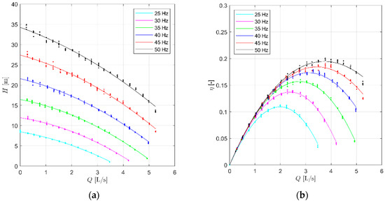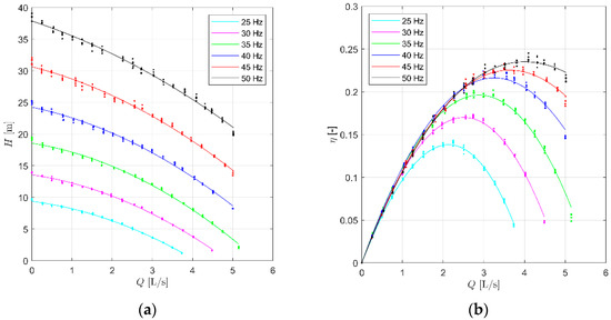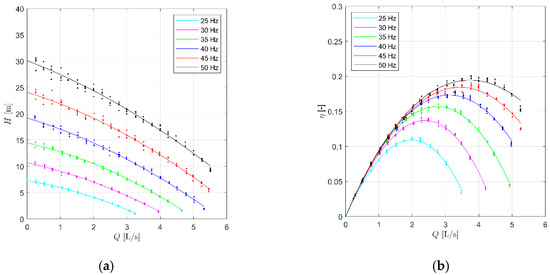 Characteristic and efficiency curves of the tested pump are shown in Figure 4 for different values of rotational speed (i.e., six different values of induction frequency of the motor), ranging between 25 and 50 Hz. In Figure 4, , , and η represent, respectively, pressure head, discharge and efficiency of the pump. The efficiency is comprehensive of both the hydraulic efficiency of the hydraulic part and the electric efficiency of the motor. The efficiency values decreased along with the rotational speed. This behavior occurs due to two reasons: the electrical efficiency of the motor reduces when the induction frequency was reduced, and the hydraulic efficiency of the pump reduces when the angular velocity of the impeller was reduced. This last behavior is in contrast with the affinity law theory but experimentally demonstrated by many studies [33,34,35]. Of course, the performance curves of Figure 4 are representative of steady conditions, while the pump usually operates in a tank whose water level is variable. Nevertheless, the water level variability inside the wet well can be considered slow, and unsteady behavior of the system can be neglected in the equations of the system (Equation (7)) without any considerable error, as demonstrated by [25]. Any further information about the pump test can be found in the ISO9906 regulation [32].