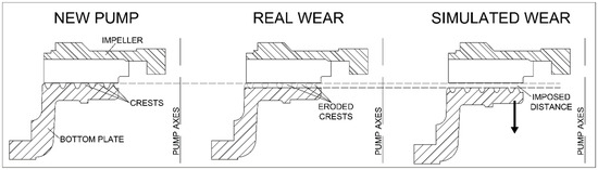Due to sediment motion, the pump was affected by progressive wear. In order to avoid the clog of solid particles between the open impeller and the bottom, the inner part of the bottom plate is generally equipped with concentric circular slots characterized by a depth of some millimeters (2 mm for the tested pump). As an effect of the wear, the crests between the circular slots are subject to a significant reduction, until a complete abrasion in the presence of high wear. As the bottom plate is abraded, the clearance between the impeller and the plate increases and the performance of the machine decreases. The effect of the erosion has been simulated. This effect has been reproduced by introducing calibrated thick elements under the fixing screws of the plate, preventing the complete tightening, imposing the distance between the plate and the impeller clearance. A sketch of the pump section with the impeller and the bottom plate is shown in Figure 5, as well as the effect of the erosion on the bottom plate and its simulation.