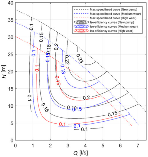 Two different stages of mechanical wear were simulated by using elements characterized by a thickness of 1 mm and 2 mm, as representative of an intermediate and high wear, respectively. Characteristic and efficiency curves of the artificially aged pump have been therefore obtained. Of course, according to this procedure, the wear of the electric motor is neglected. The aging of an electric motor has been considered much slower than the aging of both the impeller and the bottom plate which operate with sewage water. Figure 6 and Figure 7 show the characteristic curves of a pump affected by medium and hard mechanical wear, respectively.
