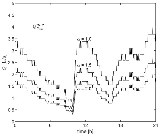 In Figure 9, the pattern is presented for different values of fraction rate α. When α is equal to 1, the flow hydrograph exhibits the highest values of the input discharge and its maximum value corresponds to the BEP discharge of the pump operating at its maximum speed (50 Hz). Higher values of α correspond to lower input discharge (i.e., the higher α is, the more the pump is oversized with respect to the inflow discharge).