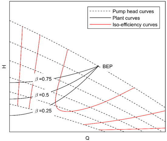The coefficient has been set equal to 0.25, 0.5 and 0.75, being representative of pumping systems characterized, respectively, by a small, medium and high elevation of the downstream tank (). The effect of on the plant curves is shown in Figure 10.