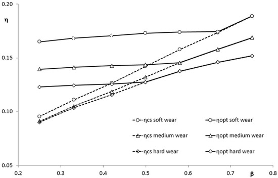 In order to deeply investigate the effect of mechanical wear on the system efficiency, new calculations have been performed by refining the steps in the β values. The calculations were carried out by assuming a slightly undersized pump (α = 1.5), which is a compromise between reliability and efficiency. The results have been obtained for different mechanical wear conditions, as shown in Figure 11. The figure shows the system efficiency in the on/off mode (dashed line) and optimal scheduling (continuous line) for different β values and mechanical wear. The effect of the optimization on the efficiency seems to be not affected by the static head; thus, the benefit decreases as β increases. For soft mechanical wear, an optimal pump scheduling ensures energy savings until β = 0.67. This value decreases as the mechanical wear increases, with a minimum value β = 0.5 for the hardest wear.