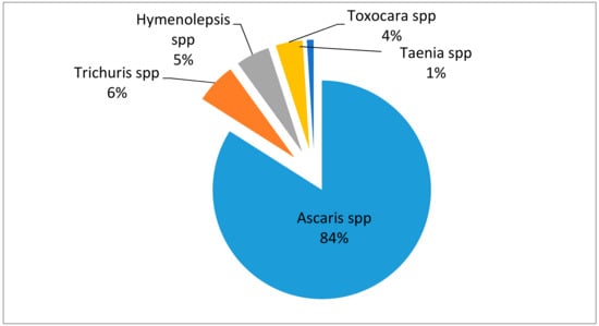 Although several STHs occur in wastewater, Ascaris species contribute 84% of the overall helminth ova genera distribution in wastewater followed by Trichuris, Toxocara and the cestode Taenia (Figure 2; [3]). Furthermore, A. lumbricoides and A. suum exhibit greater resistance to extreme conditions and treatment, such as heat, oxidants, detergents, pH and proteases [28]. Maya et al. assessed the rate of inactivation for the ova of A. lumbricoides, A. suum, Toxocara canis and T. trichiura following treatment at 80 °C for one hour at a pH of 12.1 and revealed that <25% of these STHs were inactivated [29]. For these reasons and their tendency to settle in sludge, Ascaris is considered a reference pathogen for helminths in evaluating the efficiency of the wastewater treatment processes [6,30].