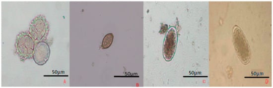 Photomicrographs of STH ova under 500× magnification (Scale = 50 µm): (A) Ascaris lumbricoides ova after 7 days of embryonation, (B) Trichuris suis, (C) Necator americanus, (D) Ancylostoma duodenale.