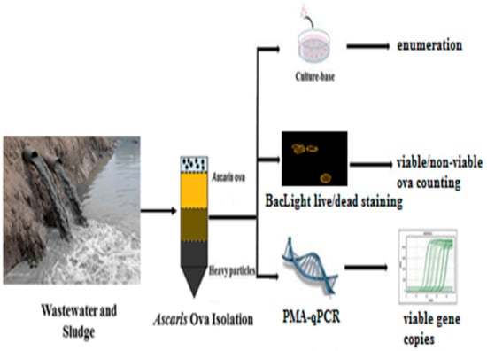 - Raynal, M.; Villegas, E.N.; Nelson, K.L. Enumeration of viable and non-viable larvated Ascaris eggs with quantitative PCR. J. Water Health 2012, 10, 594–604. [Google Scholar] [CrossRef][Green Version]