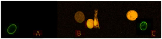 Confocal microscopy images of Ascaris suum ova stained with Syto 9 (green) and propidium Iodide (red) to determine the viability of ova: (A) Viable ova, (B) non-viable ova, (C) Both viable (green) and non-viable (red) ova.