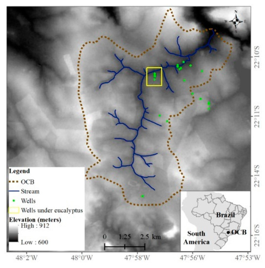 The OCB is located in an outcrop area of the Guarani Aquifer System (GAS), which is located as an unconfined aquifer and consists of sandstone layers of the Botucatu and Pirambóia Formations [32]. The site under investigation (Figure 1) has been monitored since 2004 to evaluate recharge [33], the land use change [34], the land use change effect on recharge [23], the contribution of groundwater flow to stream discharge [35], the streamflow prediction [36], and the impacts of climate change on groundwater availability [37]. The predominant land use in the study site was pastured until 2011. This land coverage changed to clones of hybrid Eucalyptus plantation (Eucalyptus grandis × Eucalyptus urophylla), also known as Eucalyptus Urograndis. The average density of the plantation is 1334 trees per hectare, with an average spacing of 2.5 × 2.5 m between trees.