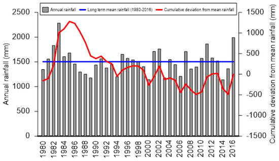A decreasing trend in the annual rainfall occurred (Figure 3). After 2011 (wet year), there was a decrease in rainfall to the lowest observed value, shown by the steeped slope of accumulated deviation relative to the long-term mean rainfall. Opposite behavior was observed in the accumulated deviation after 2014 due to an increase in rainfall amount in 2016. Moreover, 2014 was classified as a severely dry year (SPI = −1.64) and 2016 as a very wet year (SPI = 1.92).