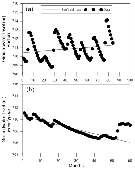 Monthly trend analysis of mean groundwater levels measured in the monitoring wells to (a) pasture and (b) Eucalyptus periods.